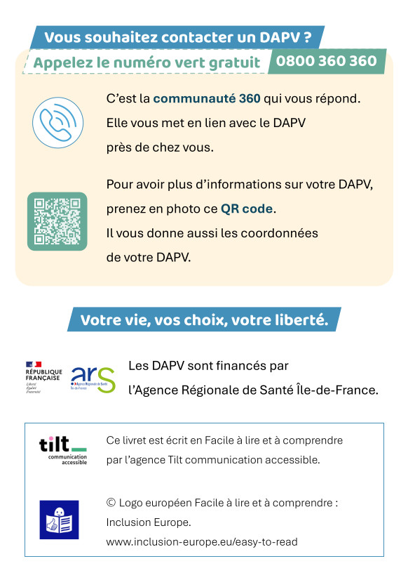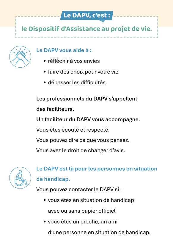 Le DAPV 77 propose un espace d’écoute et de réflexion pour les personnes en situation de handicap, visibles ou non, avec ou sans reconnaissance MDPH, ainsi que pour ses proches aidants. Le DAPV peut être sollicité à tout moment via le numéro vert 0800 360 360. Il a pour objectif de faciliter la réalisation de votre projet de vie.