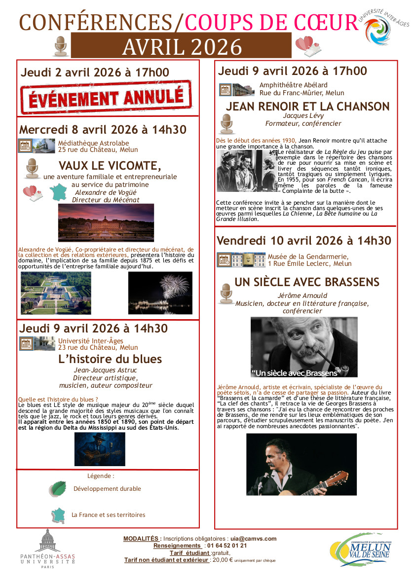 Retrouvez tous les renseignements sur les cours, sorties, conférences du mois et à venir sur le site de l'Agglomération Melun Val de Seine >>>