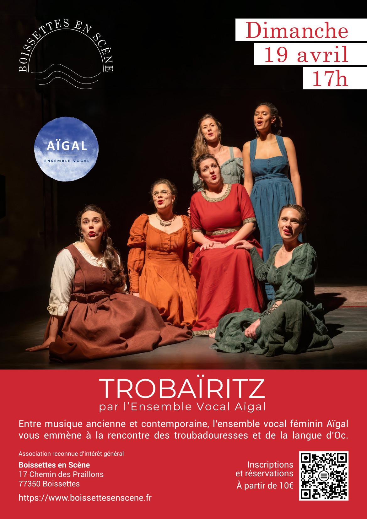 Concert Concert Ensemble Vocal Aïgal - Boissettes En Scène Entre musique ancienne et contemporaine, l'ensemble vocal féminin AÏGAL vous emmène à la rencontre des troubadouresses et la langue d'Oc Pensez à vous inscrire 19 Avr 2026 Time: 17h 17 chemin des Praillons, 77350 Boissettes Précédent Retour à la liste Suivant
