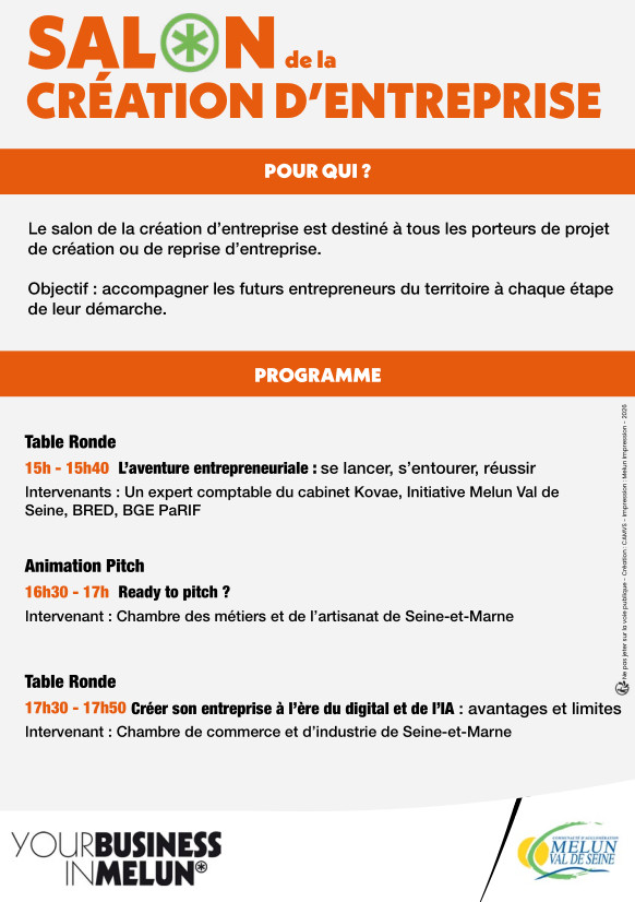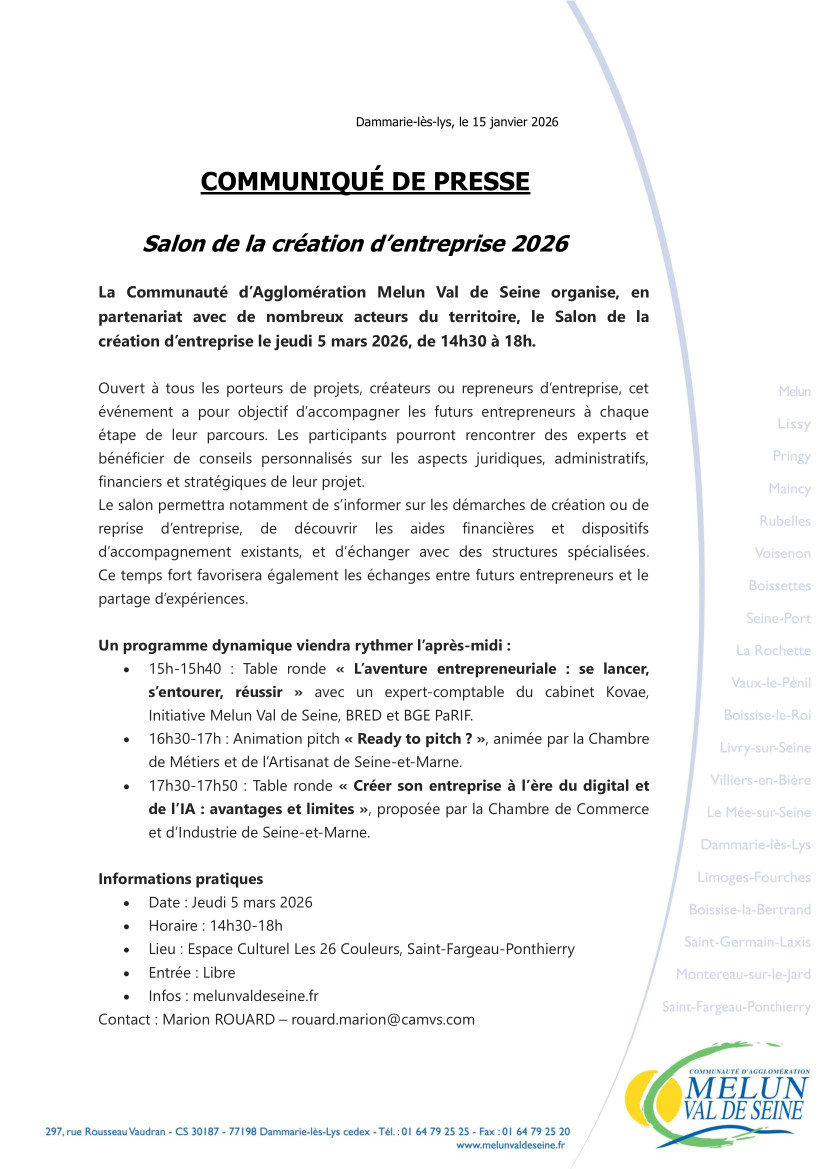 Conférence Salon de la création d'entreprise 2026 La Communauté d’Agglomération Melun Val de Seine organise le Salon de la création d’entreprise, le jeudi 5 mars 2026, de 14h30 à 18h, à l’Espace Culturel Les 26 Couleurs à Saint-Fargeau-Ponthierry. 05 Mars 2026 Time: 14h30m Rue du 11 Novembre 1918, , 77310 Saint-Fargeau-Ponthierry CAMVS Précédent Retour à la liste Suivant